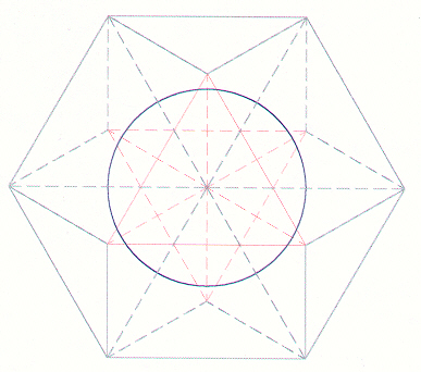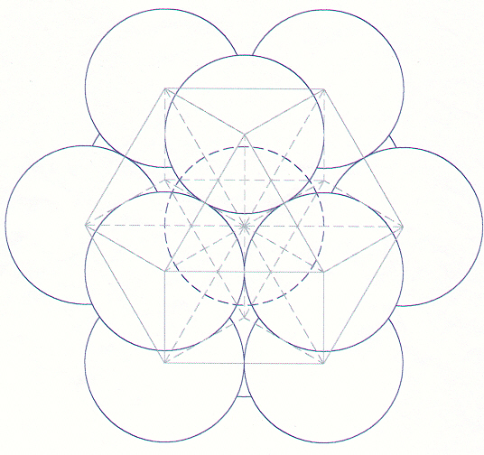 The centroid of the sphere represents the first ghost point, renzhong (man's center). The radius of a closest-packed sphere is equal to the distance from the VE centroid to the centroid of any local tetrahedron. The Star Tetrahedron within the centroid sphere is an inner Flower of Life (merkaba).