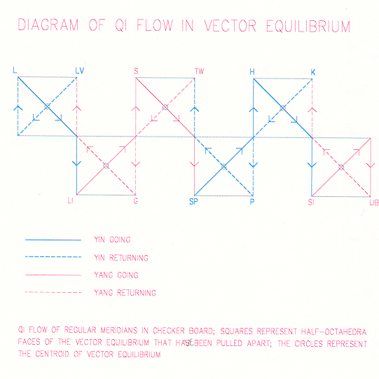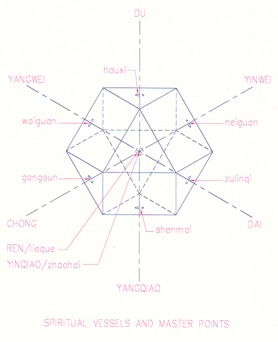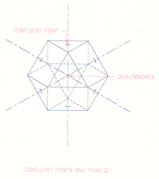 Confluent (master) points of spiritual vessels are portals in the center of the eight triangular faces of the Vector Equilibrium. These eight portals penetrate the center, mingmen-qihai, which contains yuan-source qi. Each portal is paired with its opposite via an axis (two radial vectors), creating a pulsating effect on four dimensional planes within Vector Equilibrium. Yuan-source points of regulating meridians are portals in the center of the twelve square faces of the Vector Equilibrium. They also penetrate the center, but via the circumferential vectors.