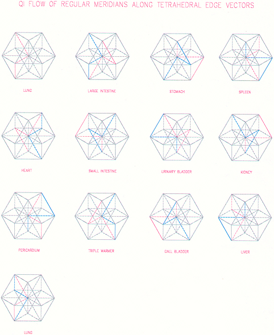 Since there is a cycle of qi flow manifested by the regular meridians, their action is much different from the spiritual vessels. Regular meridian energy spins by weaving along octahedra edge vectors of VE, while spiritual meridian energy pulsates on tetrahedra polar axes of VE. Because confluent points and source points are on the same axis, they manifest a similar energetic quality, in that they have a close relationship with the jing of the centroid.