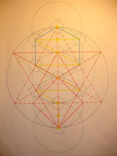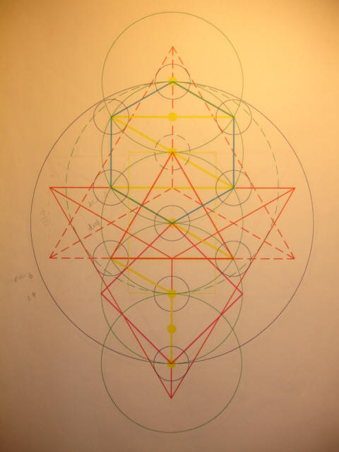 Original visualization of the Fire Spindle: Merkaba pulling apart or coming together superimposed on Kaballah construction. The triangles' center of areas move apart to intersect with each others' triangular base.