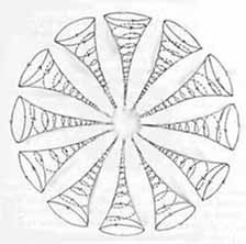 Cosmic power points upon the Earth (vortices; eg. corn fields-crop circles) have been referred to as dome centers, or ethereal energy canopies, which occupy and create sacred sites, from which extend numerous short-distant spiraling and straight dome lines, which radiate light. According to Richard Leviton, the domes are trans-dimensional magnetic/energy (existing between spirit and matter) facilitators overlaid on the physical landscape to fulfill a past proposal in the present for future events on Earth (ie.create Paradise on Earth). Each dome center carried a light form, or seed crystal. Macrocosmic star grids distribute information to the microcosmic Earth grid. Each dome has the capacity to initiate up to 48 affiliate vortices (smaller domes) on the heliocentric dome lines (spiraling out according to the Golden Proportion), which terminate into a dome cap (est.83,808 on Earth: 1746x48).