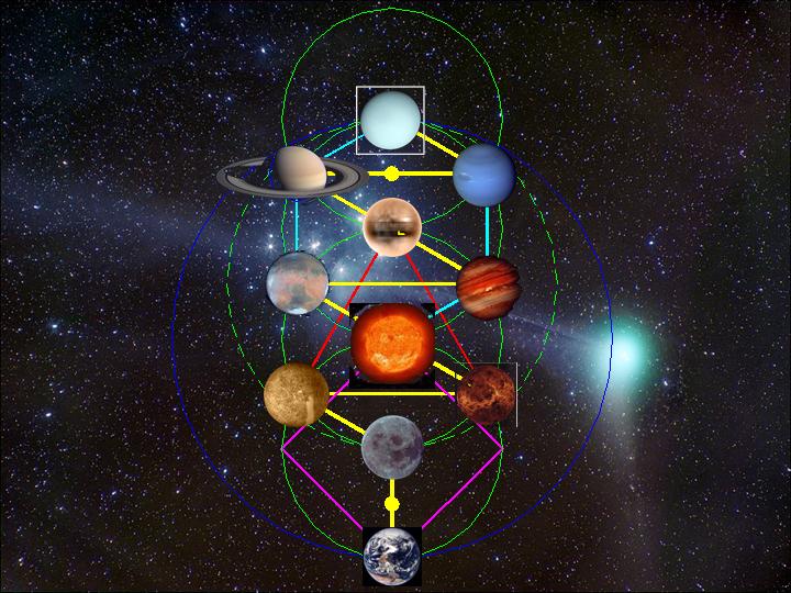 According to traditional mysticism, the Kaballah (consisting of 12 sephira: 10 manifested, 2 subtle) resonates as one vibrational network (grid) with the divine tetragrammaton (Judaic Mysticism: the unpronounceable name of God, Holy Word of "4 letters"; YHWH: Yod, He, Vau, He). The kaballah sephira represent the integrated vibration (physical-spiritual) of the solar system (ie.solar logos), which includes the celestial bodies (9 planets with sun and moon), the five elements (earth, water, fire, air/metal, and space/wood), light (heaven father), form (earth mother), and the soul and body of Adam (human child).