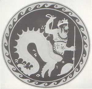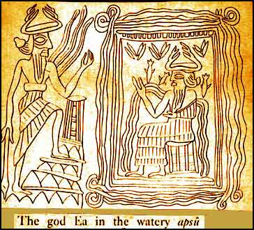 Their chosen commander, and son of Nibiru’s ruler, was a brilliant scientist and engineer, originally named He Whose House is Water (Ea), depicted as being a fish-man, fishgoat, and provider of fish (cerulean zodiac signs assoc. w/activities/reign of Ea: prototype Aquarius; also assoc. w/Capricorn and Pisces) [may explain the Sumerian epithet for founder of Eridu: “sheep of the glittering waters” (Alulim)], who later acquired the title Lord of Earth (Enki) (reigned in Eridu 8 sars = 28,800 years; Sumerian King Lists) after establishing Eridu, and nicknamed He Who Fashions Things (Nudimmud). He has been depicted as most Sumerian deities were with a horned headdress, but also surrounded by interconnected flasks. Enki endeavored in the construction of extraordinary waterworks (ie. canals, dykes, ditches, structures, water purification) in the marshlands at the head of the Persian Gulf (“Myth of Enki and Eridu,” named by S.N.Kramer; “Myth of Enki and the Land’s Order”).