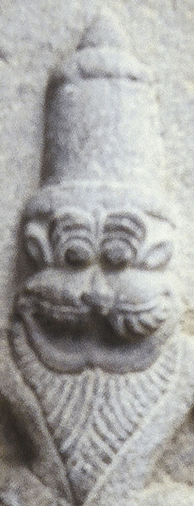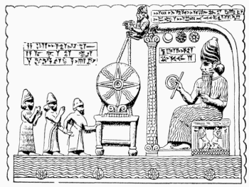 Sumerian Sun god, Shamash/Utu (Anunnaki) depicted as giant compared to priests, on stone stela at Abu Habba, Mesopotamia