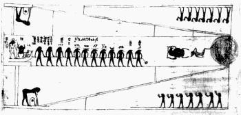 "Papyrus of Queen Nejmet" (British Museum) depicting the Pharaoh's journey through the underworld (duat); (angle of cords to "Red Eye of Horus" is similar to Anunnaki landing corridor)