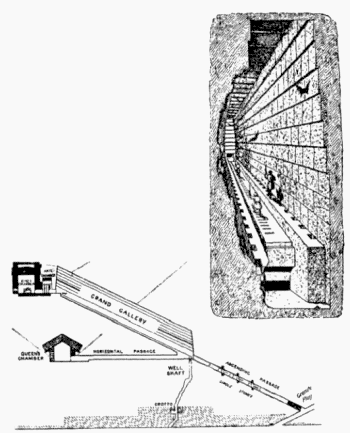 After achieving the connecting path to Vertical Shaft B, by boring a twisting connecting shaft, the rescuing Anunnaki continued in the short Horizontal Path A, which terminated into an immovable stone masonry wall (aka. wedged Ramp Stone). Already knowing the plan of the pyramid, the Anunnaki removed the wedged Ramp Stone with an explosive from Vertical Shaft B, and entered the Grand Gallery, gaining access to the pyramid’s upper chambers. [Blast-like characteristics are documented in Pyramidology (Rutherford). After the blast, the limestone fragments of the Ramp Stone slid down the Ascending Passage to the granite plug, and white powder covered the floor of the Grand Gallery; discovered by Al Mamoon’s men (820 CE).]